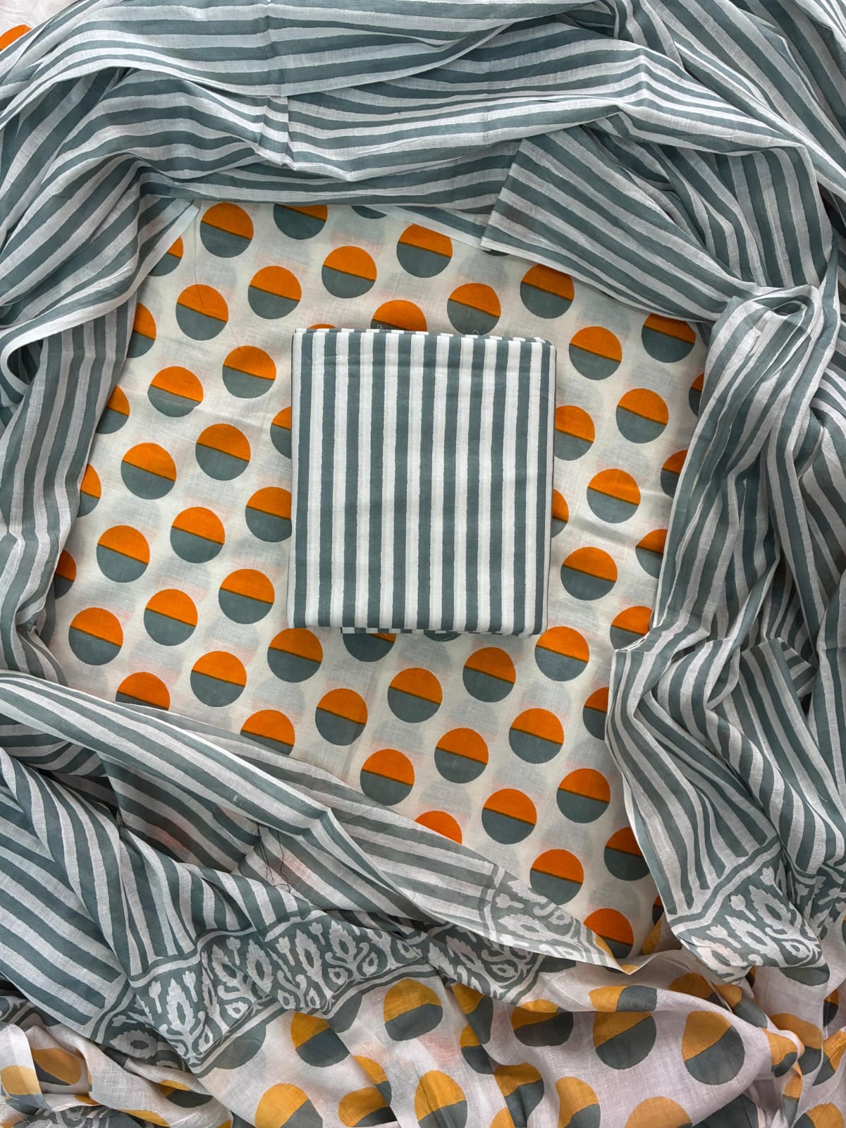 Elegant and comfortable cotton dress material set featuring beautiful prints and coordinated designs. The set includes a printed top, matching bottom, and a stylish dupatta, perfect for casual outings, office wear, or small gatherings. Soft fabric ensures all-day comfort while vibrant prints add a touch of charm.